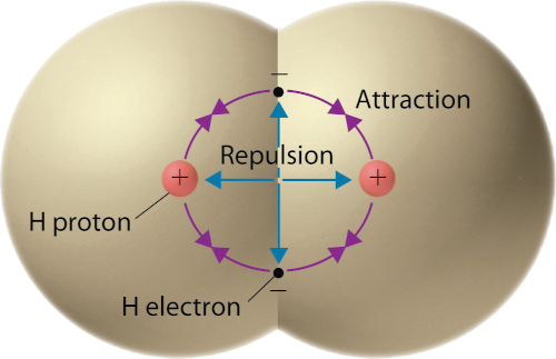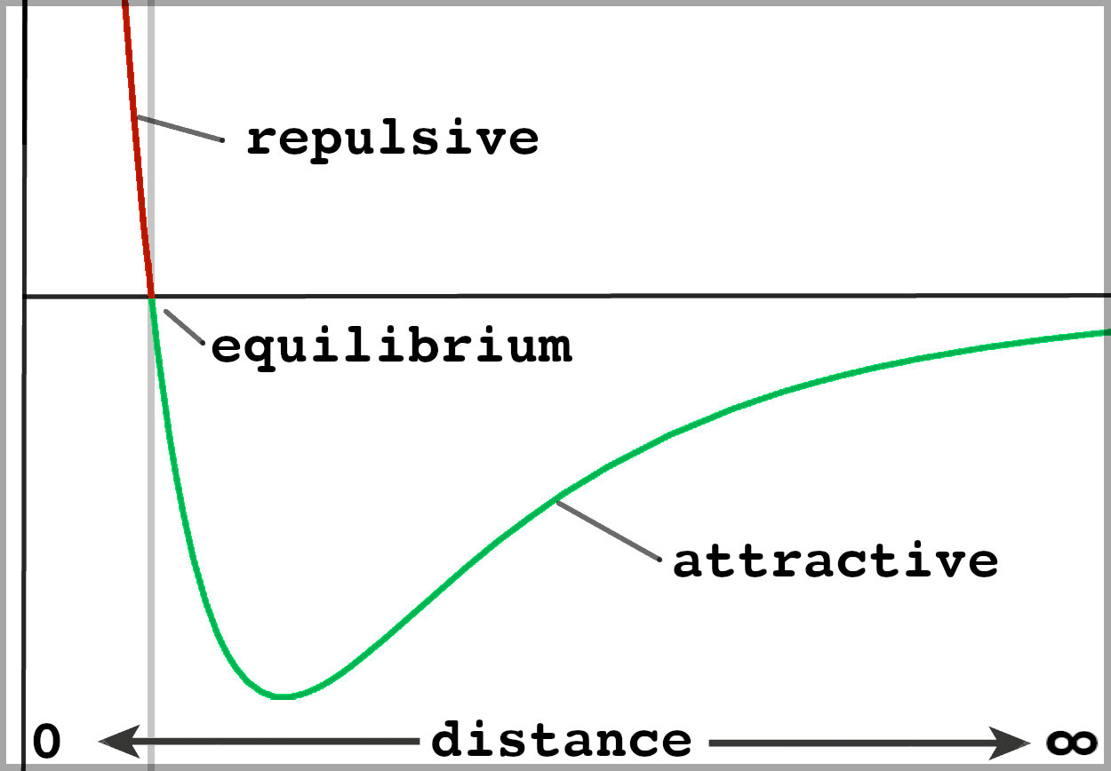 Consider Interatomic Forces. When a pair of atoms are close to each other, they attract, but if they get too close, they repel. And so they each settle into a comfortable distance. This graph plots a force field as a function of the distance between a pair of atoms, with zero at the left and approaching infinity at the right. The vertical axis represents the force (the "interatomic potential"). Forces above the horizontal line are repulsive, and forces below the line are attractive. Pairs of atoms naturally settle to the equilibrium distance. |