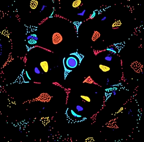 We can talk about individual dots as little characters falling in and out of love, but what's amazing is that when certain clusters of different kinds of dots come together, they can act like a super-organism - like a multicellular creature that can shapeshift, split, and merge with other entities. That's why I like to use the term "ambiguous entities". Fans of plasmodial slime molds know what I'm talking about! |