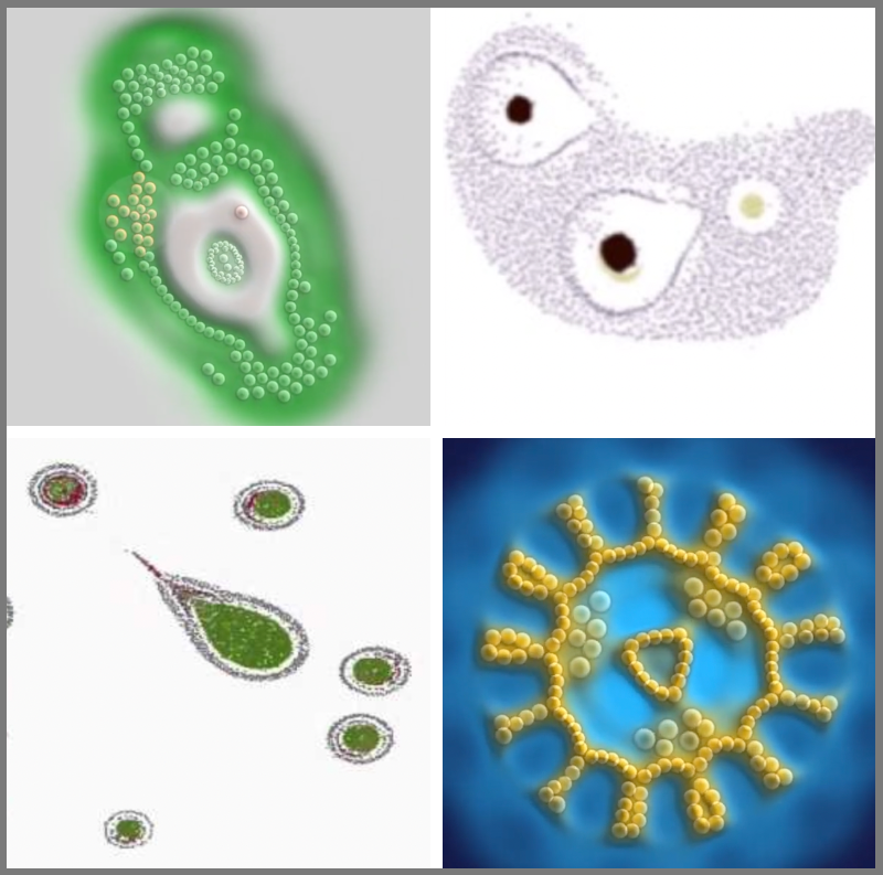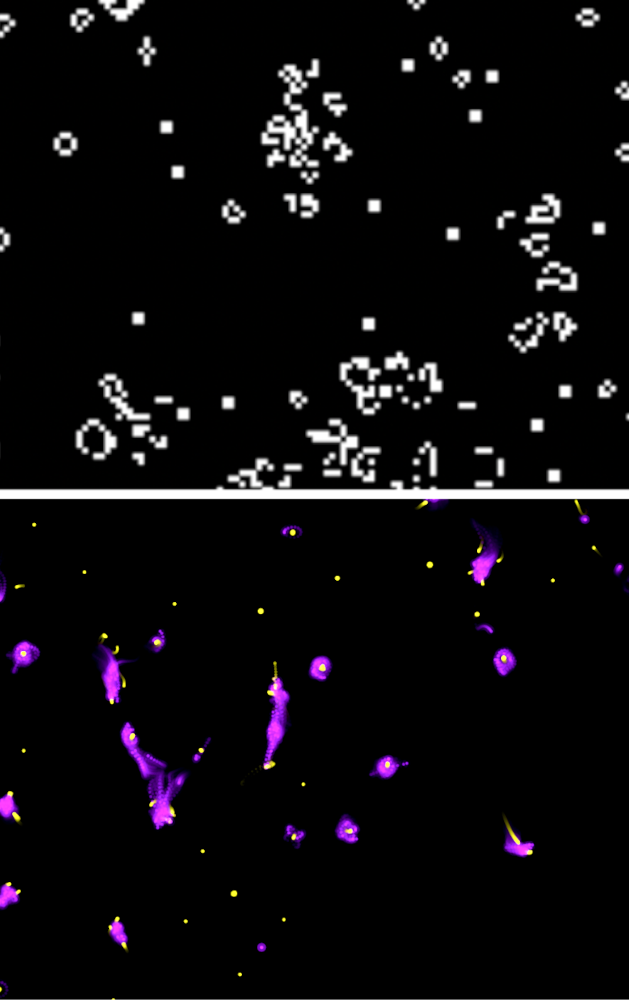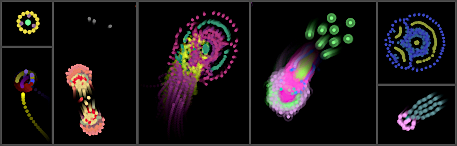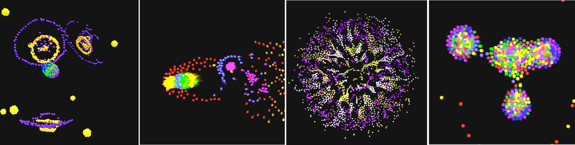 Several artificial life researchers have developed simulations involving "self-motivated" particles. Hiroki Sayama's swarm chemistry is an early example. A beautiful simulation called Particle Lenia was created by Mordvintsev, Niklasson, and Randazzo. There are many other examples; more than I can get into here. This kind of particle system has become popular, partly due to the fact that graphics hardware has become so amazingly fast - it is possible to animate tens of thousands of particles, giving rise to new complex spatiotemporal patterns that tickle the retina and baffle the mind. |