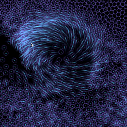 Now, according to Newton's 3rd law of motion, every action has an equal and opposite reaction. If two bodies exert forces on each other, these forces must have the same magnitude and they must have opposite directions. When two billiard balls collide, they both experience the same amount of force but in opposite directions. The Clusters algorithm allows Newton's law to be broken; forces can be asymmetrical. And that's why one dot can chase another dot around...and the other dot just keeps running away...(forever, or until the chase scene gets interrupted by other nearby forces). This creates constant motion, as if some continual energy source were at play. So, we're not talking about physics anymore. Now we are pretending that these are self-propelled entities. Biological metaphor And that's where the biological metaphor comes in. The energy sources are "inside" of the dots (they are well-fed and socially-motivated). We have abstracted away the physics level and are now looking at these dots as very simple (and very motivated) organisms. The details of locomotion are abstracted away, and so we can talk about higher-level behaviors, like the way humans move through large crowds or the way cells differentiate into tissues. The goal here is not to model anything specific in the real world, but to set up a dynamical system that generates patterns and behaviors that have things in common with natural systems. And yea, sometimes it just looks really cool. |