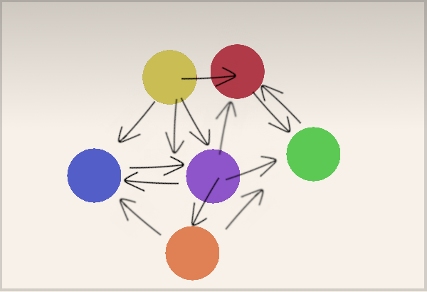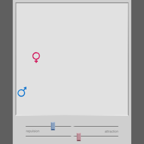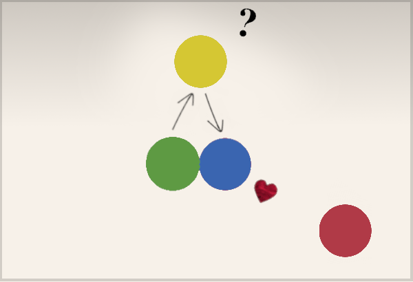 What happens if a yellow dot stumbles onto your green-blue love-fest? It's afraid of you but it loves blue dots. Meanwhile the blue dot has just noticed a red dot which it finds very attractive. Now what happens? |