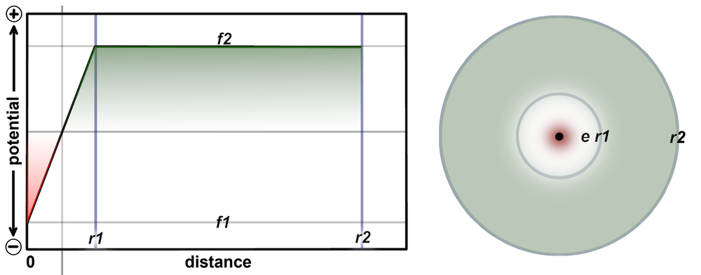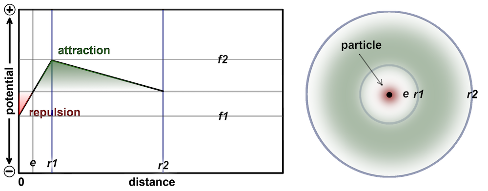 ![]() Instead of having curvy lines like the interatomic force graph, these force-fields have sharp thresholds with linear ramps between them. It is a simplified variation on the natural force field, allowing for arbitrary parameters (where the proper laws of physics need not apply). There are 4 parameters: r1 and r2 ("radius 1" and "radius 2") which refer to the two distance thresholds, and f1 and f2, which refer to the two force thresholds. The value of f1 can never be positive, but the value of f2 could be either positive or negative (see the other force field examples below). Below is another force field where the force is constant along a stretch of distance between r1 and r2. In addition to the four values described above, there is another value that determines whether the force tapers down to zero at distance r2, or stays at a constant level until distance reaches r2. Within this distance range, the particle will be forced toward the other particle at a constant rate. Notice at the critical distance r2 there is a sharp cutoff. An aggregate of particles exhibiting sudden changes in velocity is a common behavior when force fields have this feature. The original version of Clusters uses this flat force. I latter added the parameter allowing for the optional tapering down to zero. ![]() |