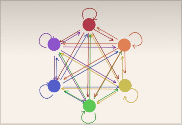 Every kind of dot has a unique way of reacting to every other kind of dot. These are force fields, and they cause dots to attract or repel when they get near each other. These forces can be weak or strong. So, if there are six kinds of dots, then there are 6x6 = 36 unique kinds of force fields - all acting in unison. |