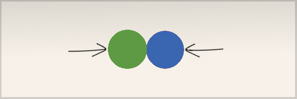 Imagine that each particle is surrounded by a circle that represents its "view horizon", as shown here with a green and red particle. These particles cannot "see" anything outside of their circles. The green particle has a red circle to symbolize its response to red particles (referring to the specific force field that comes into effect when a red particle enters the circle (comes into view)). Likewise, the red particle has a green circle. If these two particles get close enough, one or both of them will enter into the circle of the other. That would trigger a force response, as determined by their particular force parameters. Now imagine if the green particle had a larger circle than the red particle. If these particles were gradually moving towards each other, the green particle would see the red particle sooner than the red one would see the green one. This is an asymmetrical feature in the physics of this world. The other asymmetrical feature is the difference in force field profiles between the two particles. |