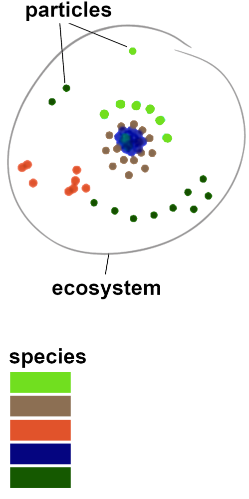 ![]() You could think of the Clusters algorithm as a collection of generalized force fields. They determine inter-particle forces as a function of distance. The profile of a force field could in fact be anything (like, any squiggly line that extends from left to right). But the Clusters algorithm was designed to use relatively few parameters enabling a large space of possible force fields. A single force field on its own is not especially interesting, but the combination of several kinds of force-fields, acting in parallel, and the fact that there can be many thousands of particles, makes it quite interesting. And that brings us to the subject of species and ecosystems. |