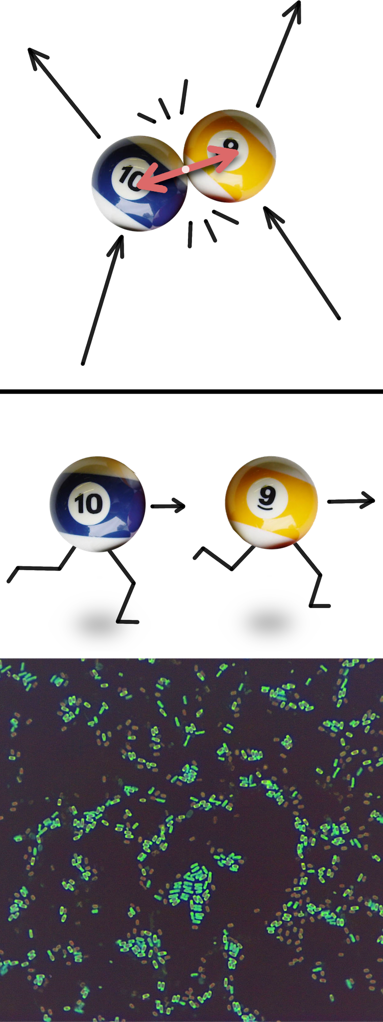 Now, according to Newton's 3rd law of motion, every action has an equal and opposite reaction. If two bodies exert forces on each other, these forces must have the same magnitude and they must have opposite directions. When two billiard balls collide, they both experience the same amount of force but in opposite directions. The Clusters algorithm allows Newton's law to be broken; forces can be asymmetrical. And that's why one dot can chase another dot around...and the other dot just keeps running away...(forever, or until the chase scene gets interrupted by other nearby forces). This creates constant motion, as if some continual energy source were at play. So, we're not talking about physics anymore. Now we are pretending that these are self-propelled entities. Biological metaphor And that's where the biological metaphor comes in. The energy sources are "inside" of the dots (they are well-fed and socially-motivated). We have abstracted away the physics level and are now looking at these dots as very simple (and very motivated) organisms. The details of locomotion are abstracted away, and so we can talk about higher-level behaviors, like the way humans move through large crowds or the way cells differentiate into tissues. The goal here is not to model anything specific in the real world, but to set up a dynamical system that generates patterns and behaviors that have things in common with natural systems. And yea, sometimes it just looks really cool. |